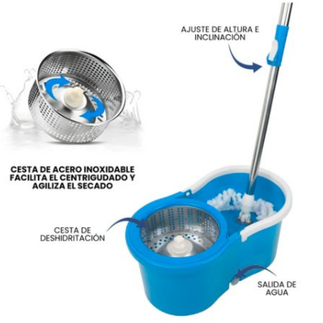 El beneficio principal de este producto es su capacidad giratoria de 360° que permite lavar y exprimir la mopa con gran facilidad.